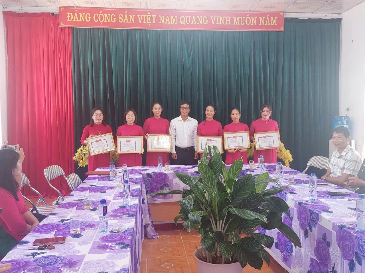 Đồng chí: Nguyễn Anh Sơn - Ủy viên BCH Đảng bộ xã, Phó chủ tịch UB MTTQVN kiêm Bí thư Đoàn TNCS HCM xã Thanh Nưa trao tặng giấy khen cho CB, GV.