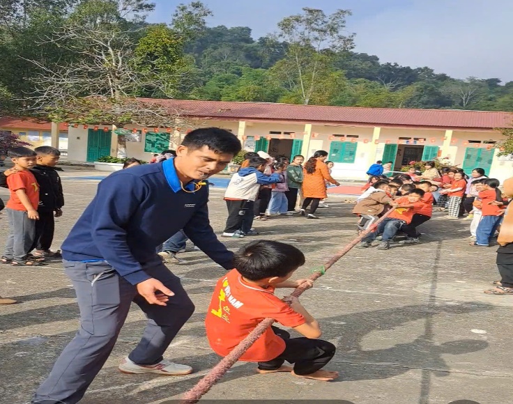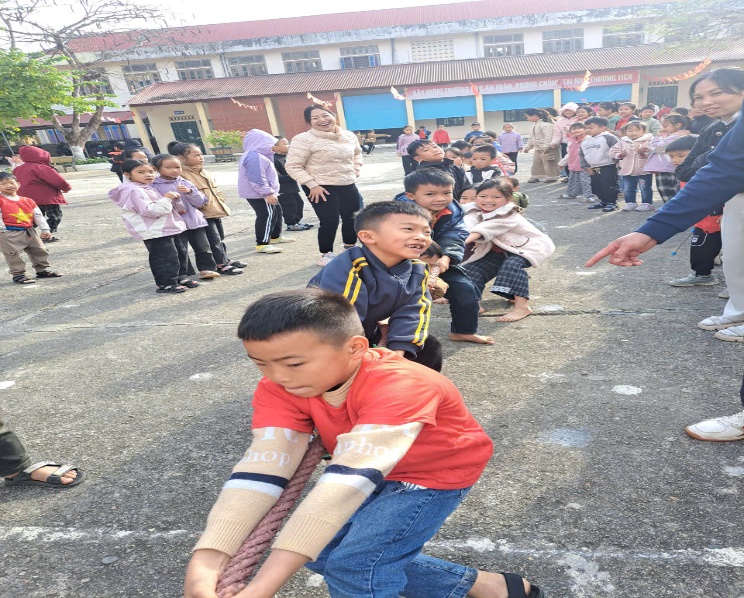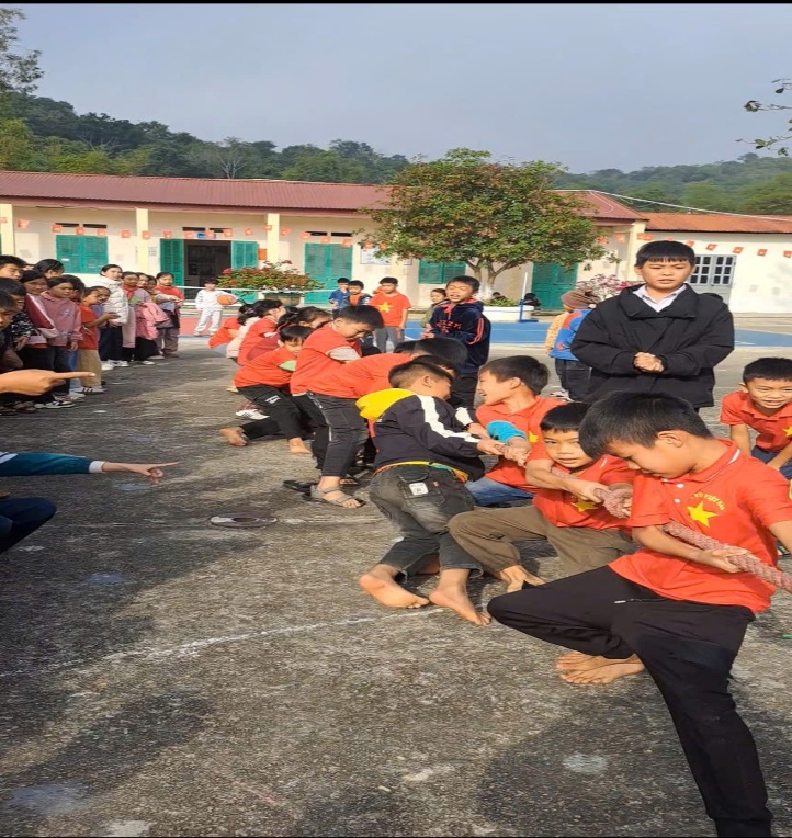 Học sinh toàn trường tham gia chơi trò chơi kéo co rất sôi nổi và hào hứng