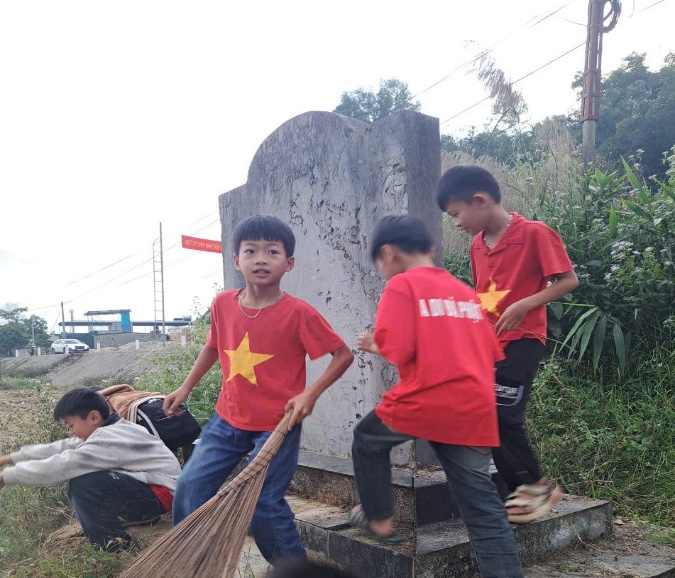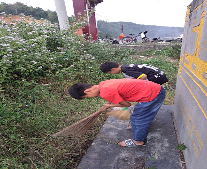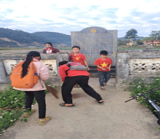 Các em học sinh chăm sóc, dọn vệ sinh khu di tích trận địa pháo bản Mển